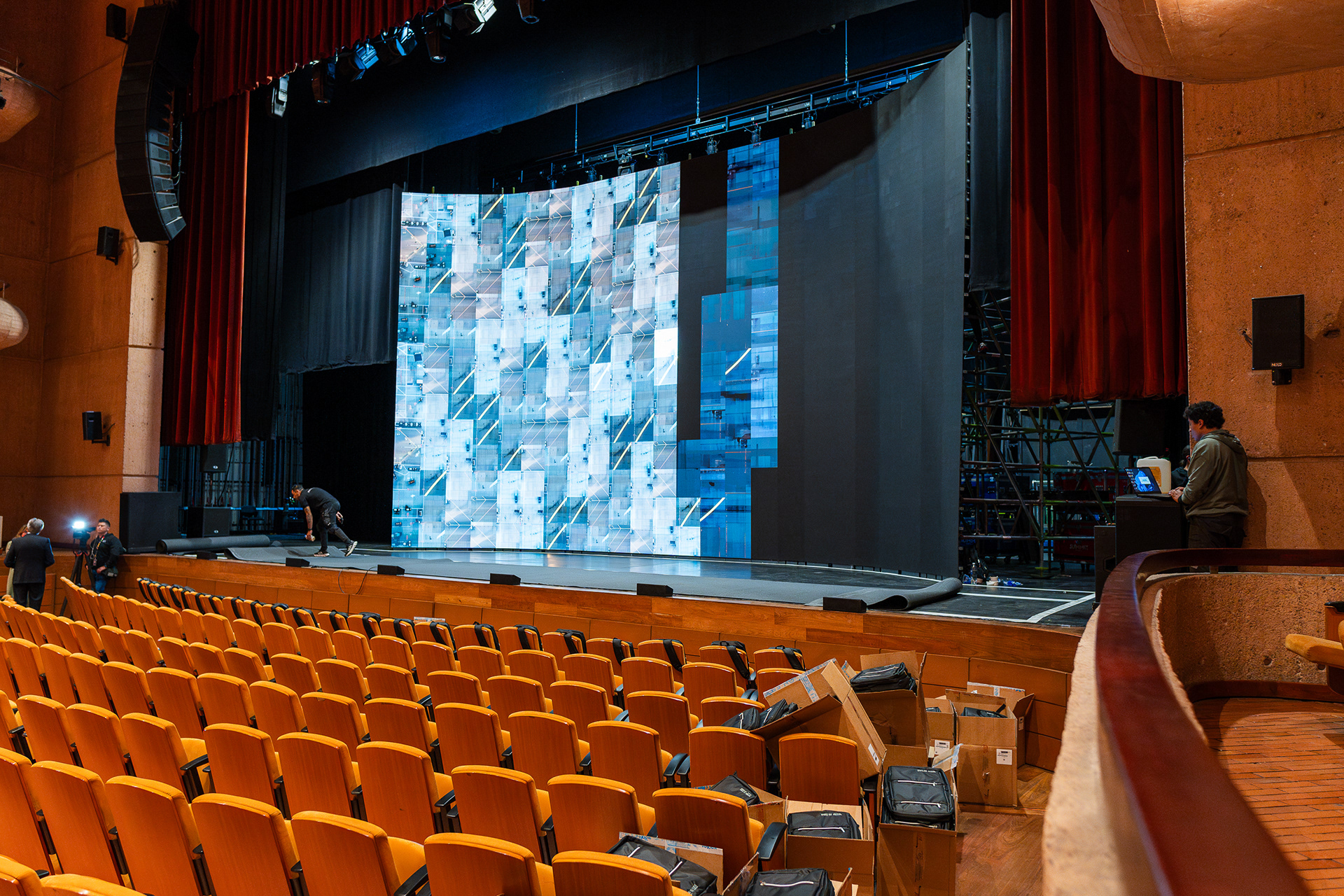 Registro fotográfico del proceso de instalación y preparación técnica de eventos, incluyendo el montaje de escenarios, iluminación, sonido, pantallas y estructura logística. Documentación visual del trabajo previo al evento, capturando el detrás de escena de la producción antes de la apertura al público.